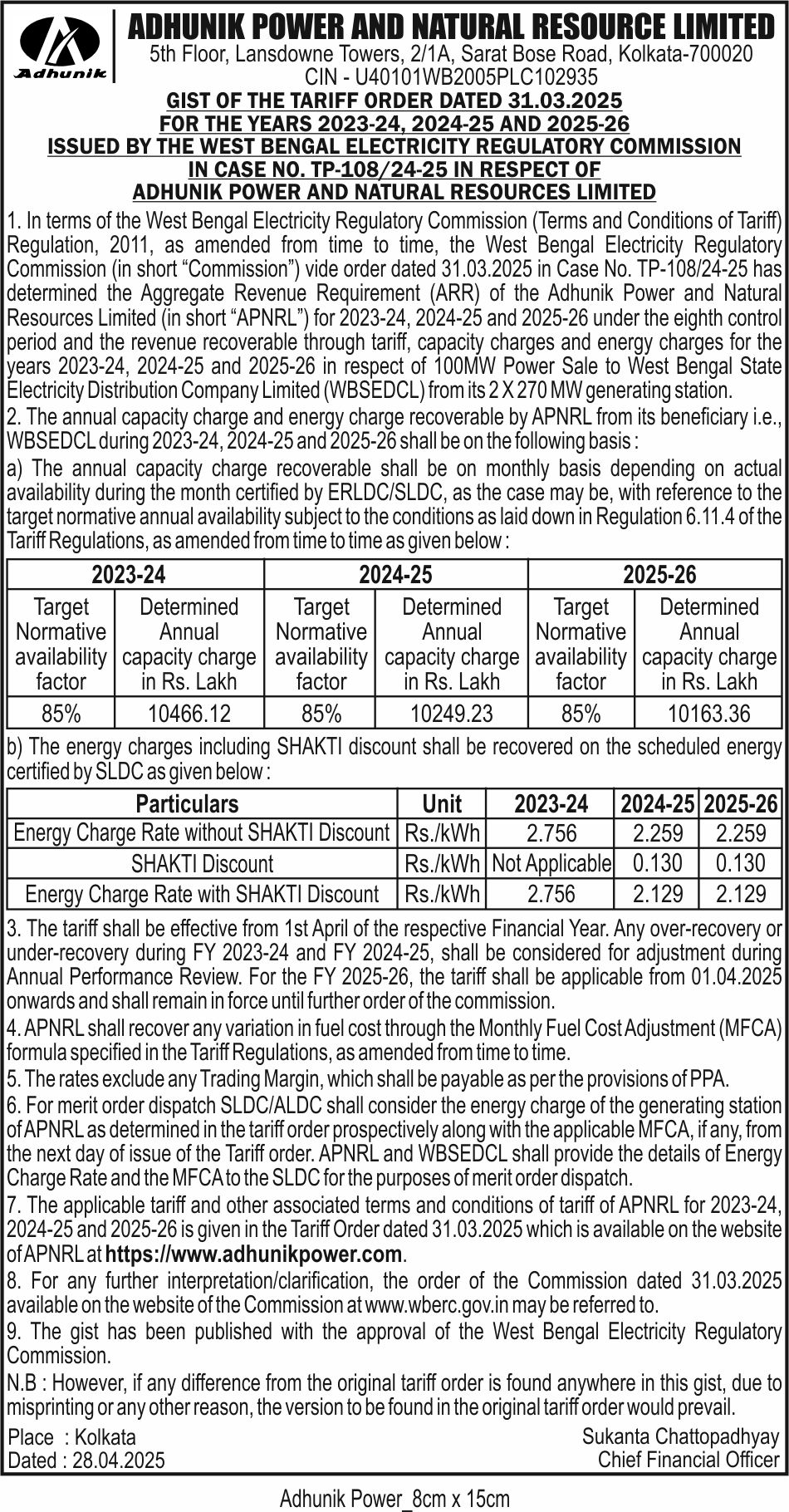2. Gist publication of Hon'ble WBERC's MYT Tariff Order of APNRL for the year 2023-24, 2024-25 and 2025-26.